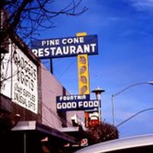 Slide, Kodachrome color: Sign of the Pine Cone Restaurant at 162 North Main Street in Sebastopol. To the left a Gadgets & Gifts signs. February, 1977.
