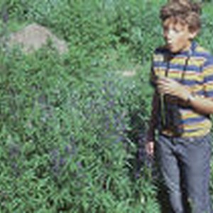 A child named David blowing a dandelion in a field of blue flowers on Chessman Ridge.