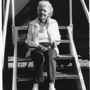 Photo--black and white: Grace Abbott photo taken at the time she recorded her oral history with Arlene Houghton in 1992 in front of the Boxcar at West County Museum.