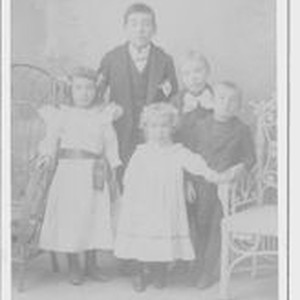 Photo--black and white, cabinet card: The Ed Elliott family, probably circa 1897. The Five Elliott children pose for studio photo. Children named but not identified in photo: George A. (1886, UK), Bert H. (1890, CA) , Annie G. (1891, CA), Chester L. (1893, CA) and Melton (1895, CA). The Elliott parents and first child George were born in England and immegrated to California. They were neighbors of the Kingwells in Bodega Township.
