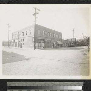 View of street corner with two-story brick buildings on Apablasa Street at the corner of Juan Street in Old Chinatown, Los Angeles. Title supplied by cataloger; title partially illegible. Note: The street name of "Apalabasa" is spelled incorrectly on the photograph, the correct spelling is "Apablasa".