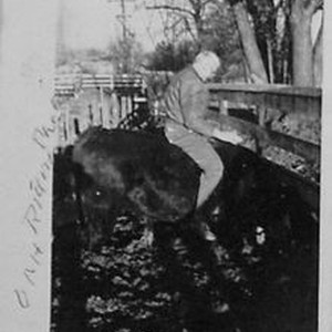 Photo, black and white: Oscar A Hallberg riding a bull.