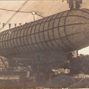 Postcard--black and white photo--Gravenstein Apple Show of 1915. Display of a Zeppelin, dirigible airship, made of whole and dried apples. Kauffman & Arnold display and sign in background left. Caption on postcard: "Apple Show Sebastopol, Cal."