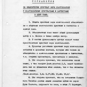 The "August agreement" document was developed by Evangelical Christian Baptists and two Pentecostal branches of CEF (Christians of Evangelical Faith) and CFE (Christians of Faith Evangelical). The document gave the right to CFE to join the Union of Evangelical Christians and Baptists (AUECB). The document was formulated at the meeting in Moscow on the 19th-29th of August in 1945. The document was signed on behalf of Pentecostal believers by D.I. Ponomarchuk (CEF), Afanasii I. Bidash (CEF), I.K. Pan’ko (CFE), S.I. Vashkevich (CFE). Yakov Ivanovich Zhidkov, Aleksei Leonidovich Andreev, M.I. Galyaev, M.A. Orlov, A.V. Karev and Ivanov signed on behalf of Baptists and Evangelical Christians. [Description English/roman)] Документ «Августовское соглашение» был выработан между Евангельскими Христианами-Баптистами и двумя пятидесятническими направлениями ХЕВ (Христиан Евангельской Веры) и ХВЕ (Христиан Веры Евангельской). Этот документ давал право вступление ХВЕ в объединенный союз Евангельских Христиан и Баптистов (ВСЕХБ). Документ был составлен на совещании в Москве 19-29 августа 1945 года. От имени пятидесятников документ был подписан Д.И. Пономарчуком (ХЕВ), Афанасій И. Бидашем (ХЕВ), И.К. Панько (ХВЕ), С.И. Вашкевичем (ХВЕ). От имени баптистов и евангельских христиан стояли подписи Яков Иванович Жидкова, Алексей Леонидович Андреев, М.И. Галяев, М.А. Орлов, Александр Васильевич Карев, И.Г. Иванов. Этот документ был онулирован после выхода пятидесятнических церквей из союза ВСЕХБ в 1989 году. [Description (original non-English/roman language/script)]