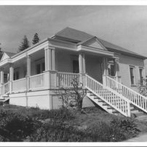 Photo, black and white: Sebastopol house at 524 South Main Street, Hip roof cottage about 1900 in the Calder Addition. House photographed in 1993 by Evelyn McClure for her book "Sebastopol, California : History, Homes and People."