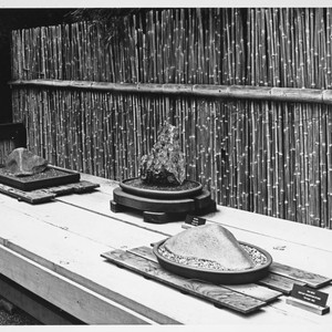 A view of three suiseki, or Japanese viewing stones, on display in the Japanese garden. They are arranged on a wooden surface with a bamboo screen in the background. On verso: Japanese Garden : Sui Seki. On verso: Staff photo by Margaret Stovall, 1972.