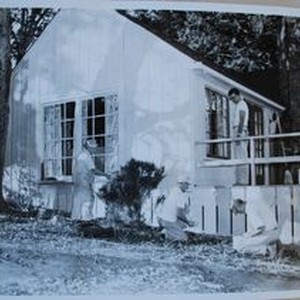 Photo--black and white: Sebastopol Lions Club scrapbook photo: Group of Lions Club men painting a house. L-R: Dick Dickenson, John Fore, Ed Herring and Phil Wetch on porch. Circa 1955.