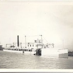 Photo--black and white: P&SR steamer Petaluma seen in October, 1947. The steamer hit a submerged piling in Petaluma Creek and sank into the mud near Haystack. The steamer was repaired and put back into service. The Petaluma was the last river steamer in service on the West Coast when it was retired in 1950. Caption taken from "Petaluma & Santa Rosa Railway" by J & K Schmale.