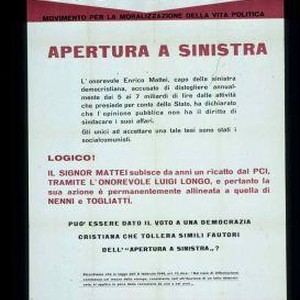 Voce libera ... Apertura a sinistra. L'onorevole Erico Mattei, capo della sinistra democristiana, accusato di distogliere annualmente dai 5 ai 7 miliardi di lire dalla attivita che presiede per conto dell Stato, ha dichiarato che l'opinione pubblica non ha il diritto di sindacare i suoi affari. ... Puo essere data il voto a una Democrazia Cristiana che tollera simili fautori dell'"Apertura a sinistra"?