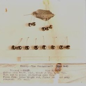 Photo, black and white: A display of Luther Burbank cherries identified as "New Productive" (Tree G-9). Botanical information attached. 1927.
