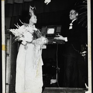 Photograph of "Miss Dorothy [?]ines, receiving a television as an award from "Elder Hick Mak[?], Church of God in Christ, Chicago, Illinois, 1950s or 1960s. From Corby Bush? "Please credit foto 'Whitey' Pic, Chicago" -- stamped on back. [Description English/roman)]