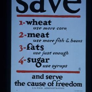 Save 1. wheat, use more corn. 2. meat, use more fish and beans. 3. fats, use just enough. 4. sugar, use syrups - and serve the cause of freedom