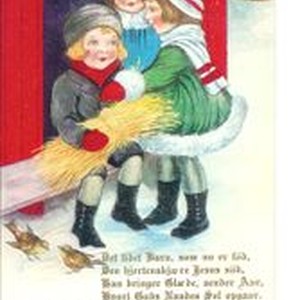 Postcard--color picture: Christmas greetings in German. Three children in winter setting. Handwritten message on back in German.