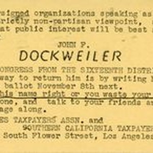 A postcard, addressed to Mr. Henry J. Dockweiler, containing a typewritten political message in support of John F. Dockweiler's re-election to congress representing the sixteenth district.