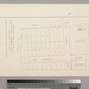 Subdivision bordered by Main, Sixth & Los Angeles Streets with numbered parcels, courses, distances; shows J.J. Warner Reservation, Rivara & Vignolo, Reyes properties. Alt. title supplied by cataloger.