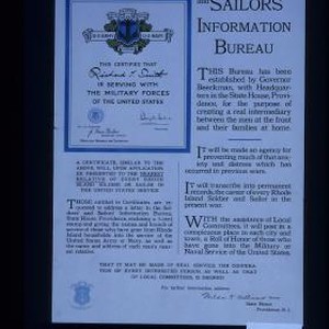 Rhode Island Soldiers and Sailors Information Bureau. This Bureau has been established by Governor Beeckman, with headquarters in the State House, Providence, for the purpose of creating a real intermediary between the men at the front and their families at home ... For further information, address Milda K. Williams, Director