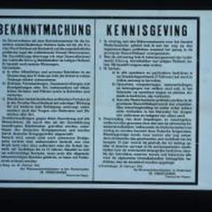 Bekanntmachung. ... In allen ... betriebenm ist am Donnerstag, den 27. Februar fruh, die Arbeit in vollem Umfange wieder aufzunehmen. b) Aufzuge, Versammlungen ... auf Strassen und Platzen sowie in Betrieben sind verboten. ... Den Haag, am 26.Februar 1941. Der Wehrmachtbefehlshaber in den Niederlanden, Fr. Christiansen, General der Flieger. / Kennisgeving. 1. In overleg met