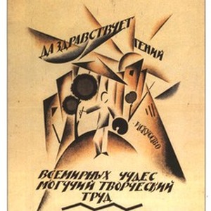 A poster dedicated to creativity in work. Caption reads, "Da zdravstvuet genii vsemirnyx chudes -- moguchii tvorcheskii trud / Да здравствует гений всемирных чудес - могучий творческий труд", meaning, "Long live mighty creative labor". [Description English/roman)]