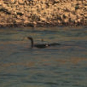 A dark-colored cormorant swimming with a fish in its beak near the Oregon Institute of Marine Biology.