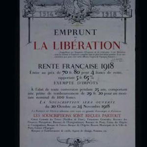 Emprunt de la liberation. "J'appellerai cet empruunt, l'emprunt de la liberation. Cette liberationnous la voulons et l'esperons complete dans le plus bref delai possible. Et je suis convaincu que pour cette tache affluera l'argent de l'epargne francaise." L.-L. Klotz, Ministre des finances. Rente fraincaise 1918 ... exempte d'impots ... La souscription sera ouverte du 20 octobre au 24 novembre 1918. La Banque de France admettra cette rente en