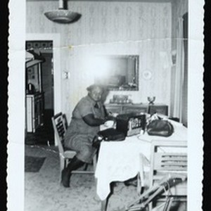 Photograph of an unidentified woman sitting at a dining room table, [s.d.]. "A734" -- stamped on back. [Description English/roman)]
