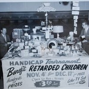 Photo--black and white: Sebastopol Lions Club scrapbook photo: Prizes for bowling tourney with Glenn Klineman, left, and Phil Wetch right. The interior of Sebastopol's bowling alley, L & L Lanes, is seen. Circa 1960