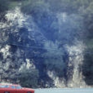 Oil seeps out of pipe along side of mountain next to the highway.