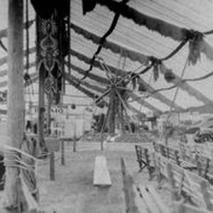 Photo--black and white, from Borba 8" x 10" celluloid negative: Gravenstein Apple Show display of a Ferris Wheel made of whole and sliced apples. To the left the Standard Oil "Flamo" display and to the right a vintage car. Circa 1930s. Hand scratched at bottom of photo "Borba Photo."