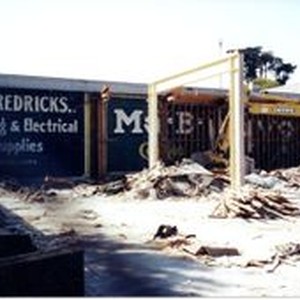 Photo--color: Demolition of the R S Basso building on North Main Street, Sebastopol that reveals a painted advertizement on the standing wall for R.E.Fredricks, Plumbing & Electrical Supplies and Mazda Lamps.