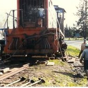 Photo--color: Workmen are removing the P&SR railroad tracks on South Gravenstein Highway 116 near Industrial Avenue and Sparkes Road circa 1984 with the help of a Southern Pacific engine.