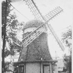 Photo--black and white: 1912 Gravenstein Apple Show display of windmill made of whole and dried apples under large tent. Photo is copy of original postcard #2695.