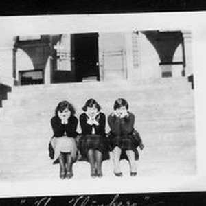 Photo--black and white: two photos of Bunni and two friends at Analy High School and another with Bunni seated on a stone wall with the name "Lyma Green, Supervisor" engraved on wall.