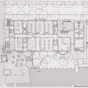 The plot plan for the first floor of the Materials Research Lab building shows the intricacies of fitting new buildings into the campus. The original Engineering building is immediately to the south, with an access road, pedestrian and bike paths surrounding the building. The addition of outdoor courtyards and abundant landscaping allow for a relaxing exterior space. The close proximity to other engineering and science buildings facilitates the interdisciplinary nature of much of the research that takes place at MRL.