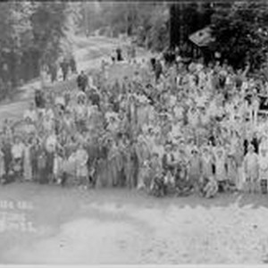 Postcard-black and white photo: A large group waiting for the train at Rio Nido, California. Caption on picture: "Rio Nido, Cal. Train Time July 3-25" 1925.