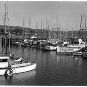 Photo--black and white: Boats in Bodega Bay harbor.