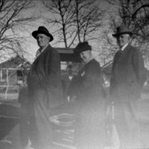 Photo--black and white, from Borba 8" x 10" celluloid negative: Three unidentified older adults, one woman between two men stand in front of a vintage car, possibly circa 1920s.