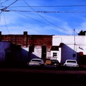 Slide, color transparency: The rear of stores on Sebastopol's North Main Street. Montgomery Ward sign is seen. 1977.
