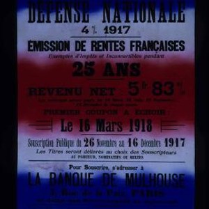 Emprunt de la defense nationale 4% 1917. Emission de rentes francaises ... Souscription publique du 26 novembre au 16 decembre 1917 ... Pour souscrire, s'adresser a la Banque de Mulhouse