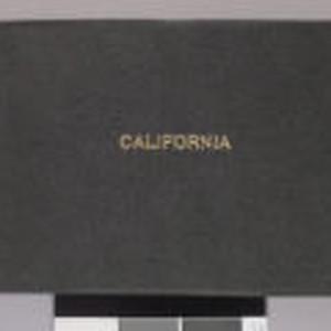 Bound in black textured material. The title "California" is embossed on the center of cover in gold lettering. The number "82" is affixed to the top of spine with glue. Images are primarily souvenir photographs, postcards, and clippings collected by Charmian London of and related to the state of California. Included are a few photos of the Bohemian Grove group, but none include Jack London himself. Very light wear over surface. Moderate wear where edges meet spine. Pages 75-100 are blank.
