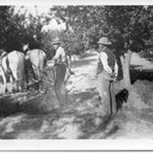 Photo--Black and white: Oscar Hallberg behind two hitched horses working the Hallberg orchard. His father John Hallberg stands to the side. 1915