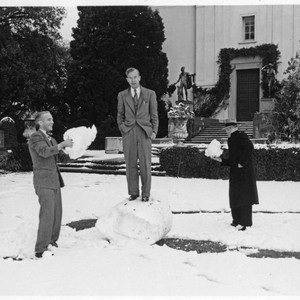 Carey Bliss stands on a large ball of snow while Graydon Spalding and John Moslander hold smaller balls in their hands. MS notes on verso read "Jan 11, 1948" and "Carey Bliss, L - Graydon Spalding, R - John Moslander." Date should read January 11, 1949.