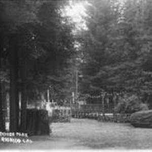 Photo--Postcard--black and white: The Rio Nido dance platform circa 1920. Japanese lanterns are hung around the platform, redwood trees in the background. Large redwood logs are next to benches. Tennis courts are to left. Recreation area on the Russian River. Handwritten caption: "Rio Nido Park Rio Nido, Cal."