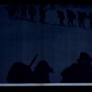 Image / Poster depicting troops plodding through a snowy mountain pass [lower right quarter]