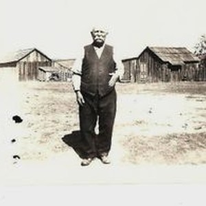 Photo--sepia: Henderson Thorn at 72 years old on September 21, 1923. Farm buildings are seen in the background. Thorn was Mrs. Sharp's father and grandfather to Gertie, Clifford, Lester and Ethel Sharp.