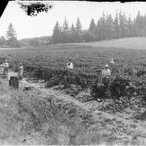Negative glass-plate photo: From a glass plate negative made by William Borba. A large field of berries with a group of men and women berry pickers. Berry boxes are stacked to the left. Large trees in the background. Circa 1915.