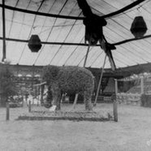 Photo--black and white: Gravenstein Apple Show display, about 1930s by the Sebastopol Chamber of Commerce Twenty Thirty Club of an elephant made of sliced and whole apples. Displays are seen in the background, all under the huge display tent. Hand scratched at bottom right "Borba Photo."
