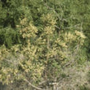 Tree in bloom among other green shrubs and woody growth.