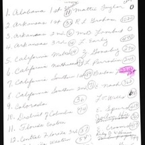 Tallies of red cards from Church of God in Christ jurisdictions, 2000 May. Broken into three groups, handwritten on "Westin Bonaventure, Hotel and Suites, Los Angeles" letterhead. Each entry includes a state, a jurisdiction, a count of cards, a name, and a compliments count. [Description English/roman)]