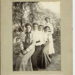 Photo--black and white mounted on posterboard: A group of five women, four seated and the fifth standing identified on back as: Julia Moll, Emily Moll, Eugene Moll, Miss Tamming and D. (Delphine) McChristian. August 20, 1899 Compliments of Mr. Fratis. Delphine McChristian was the daughter of James McChristian one of the California Bear Flagger of 1846.