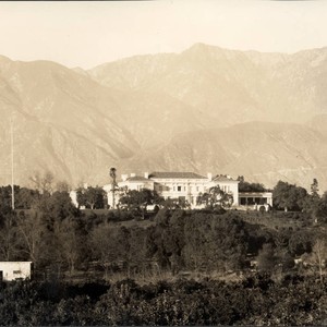 View of the Huntington residence from a distance soon after it was built, with the mountains in the background. Stamp on verso reads, "Photographs from Frederick W. Martin, 60 E. Colorado St., Pasadena, Cal." Another reads "1787." MS note on folder says, "HEH residence, c. 1911-1912."